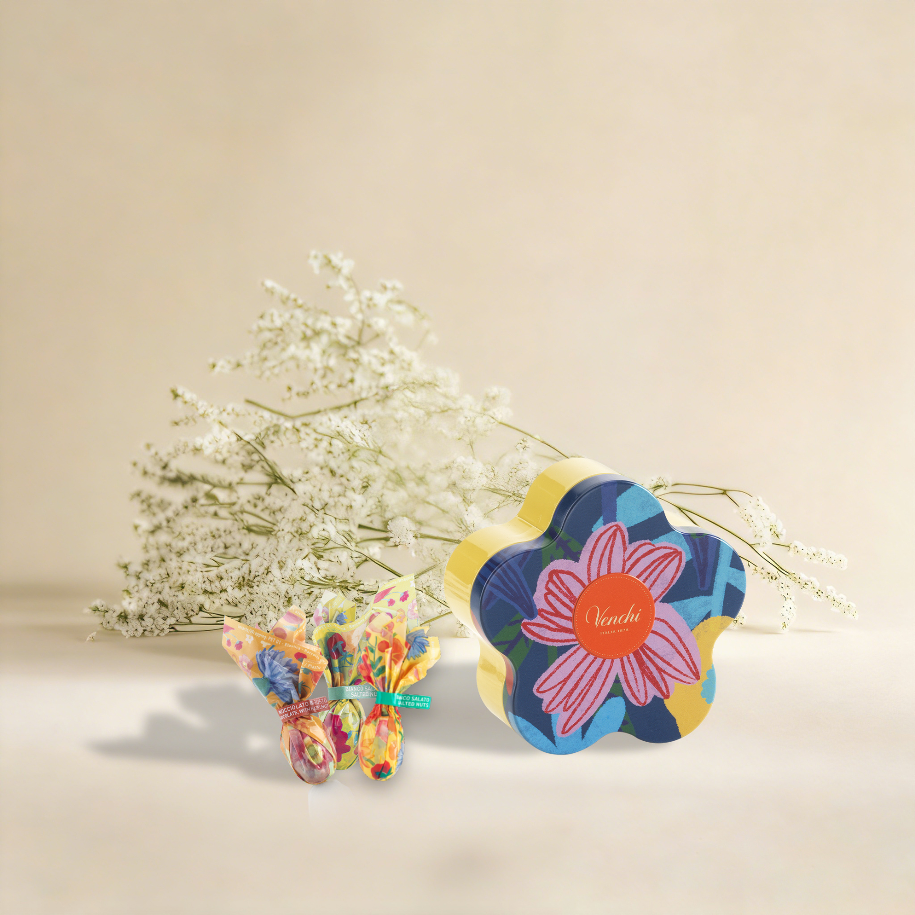 Charming flower-shaped metal tin filled with 5 limited-edition mini chocolate eggs in 3 delightful flavors: vibrant Pistachio, rich Hazelnut Dark Chocolate, and indulgent White Chocolate with Salted Nuts.