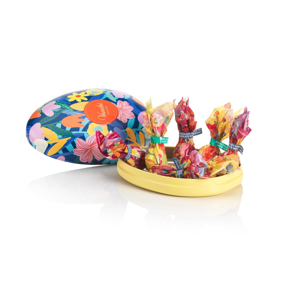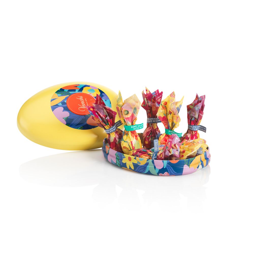 Classic egg metal tin available in 2 elegant colors, containing 7 limited-edition mini chocolate eggs in 3 irresistible flavors: vibrant Pistachio, rich Hazelnut Dark Chocolate, and indulgent White Chocolate with Salted Nuts.