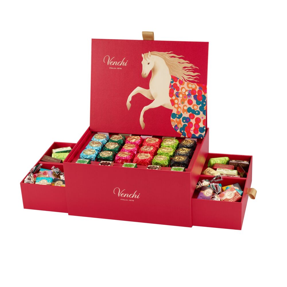Radiating festive elegance, this luxurious double-layer gift box features Venchi’s iconic horse motif and vibrant red design.